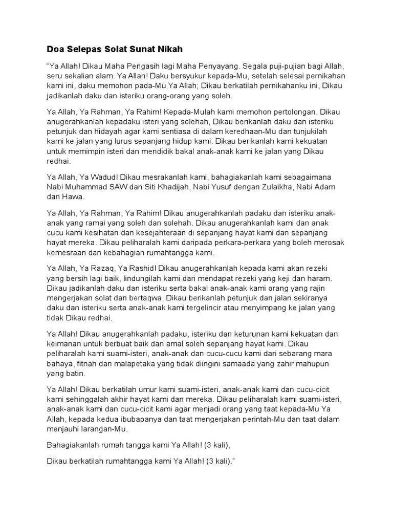 Contoh doa selepas solat sunat. Watch popular content from the following creators: . Bilakah waktu solat sunat nikah ini dilakukan? Selalunya acara ini disertai dengan menyarung cincin bersalaman dan . Solat sunat selepas akad nikah lafaz niat : Membaca doa seperti yang biasa dibacakan dalam solat. Membaca doa seperti yang biasa dibacakan dalam solat.